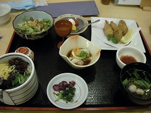この後お膳とやや遅れて焼牡蠣が到着する。お膳は定番の牡蛎フライに牡蠣の酢の物、牡蠣のサラダに牡蠣ご飯といったところ。牡蛎フライがうまいが、牡蠣の酢の物もなかなかにいける。どうやらここの牡蠣はどちらかいえば焼きよりも生に合っているバランスのような気がする。私としては牡蠣は焼牡蠣が一番好きなのであるが。