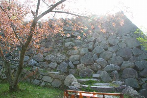 左 本丸は桜の名所でもある 中央 天守台手前には神社関係の建物らしきものが 右 毘沙門曲輪との間の石垣 天守台も残存しているが、崩落の危険があると言うことで残念ながら立ち入り禁止。確かに下から見上げただけでも石垣が大分緩んできていてかなり危ない状態。これは早々に整備をしてもらいたいところ。この城は結構近年まで荒れ果てた状態だったということなので、それが100名城選定にマイナス要因になった? なおこの地域は石材が不足だったために、秀長が城を整備した時に墓石や地蔵まで流用したとのことで、今でも逆さ地蔵などと呼ばれている地蔵が残っていたりする。