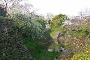 二の丸から本丸の方に回り込むが、この本丸を取り巻く石垣と堀がさらに立派で唖然とする。つくづくこの城は100名城に匹敵すると感心することしばし。ここから本丸に渡るルートは今は堀を埋め立ててあるが、往時は防御を考えるといざというときに落とせる木橋になっていたのだろうと思われる(外から見ると、この部分の石垣が他の違うのが一目瞭然)。なお本丸内は今は神社になっているというお約束のパターン。季節柄花見客が押しかけていて城見学という風情ではないのが残念。またトランクを引きずっているので神社周辺の砂利道は難行苦行。こんな立派な城だったらトランクを置いてくるんだったと後悔することしばし。