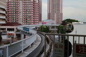 左 交通システムの軌道 中央 沿線の風景 右 女子大駅にある予備車両 列車は15分ほどでコースを一周して元の駅に戻ってくる。数分後にこの車両がまた折り返し運転するようである。イメージとしては「遊園地の遊覧電車をもっと本格的にしたもの」。沿線は典型的なニュータウンであるが、学校なども多かったことから平日にはそれなりの需要はあるのだろうと推測される。また東京方面に出勤する場合、車だと都内で持て余すのでやはり鉄道は不可欠であろう。ニュータウン向けのアクセス鉄道という点では広島のスカイレールサービスにイメージが近い。