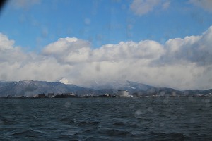 雪見船はかなり小型の船 雪見船はミシガンよりは二回りほど小型の船である。これで琵琶湖観光クルーズというところだが、生憎と天候が不順。激しく吹雪いて周囲がろくに見えなくなったりするかと思えば、突然に晴れて明るくなったりなどと目まぐるしくて訳が分からない。