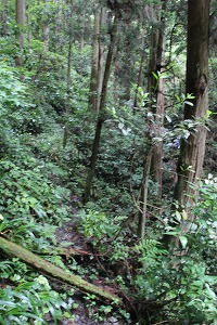 看板に従って雌滝を目指したのだが、道なき道を進む羽目になる しかしこれが失敗。ここから先は道なき道になり、川沿いの足を滑らしたらまず無事には済まないようなところを歩くことになる。道は悪いし(というか、そもそも道なのかという疑問さえ湧く)、足下が濡れているので危ないことこの上ない。私は山城攻めの続きで簡易ハイキングシューズに登山杖という装備なので問題ないが、まかり間違って普通の観光客が入り込んだらとんでもないことになるのではないかと思われる。