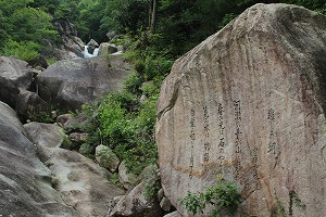 滝を堪能すると引き返す。すると先ほど雄滝の方に私の先客として来ていたかわいい女の子四人組(大学生というところか)が看板のところで雌滝の方をどうするか迷っていたので、その靴だと絶対無理だから止めておくようにと言っておく。とてもではないがパンプスで歩けるような道ではない。