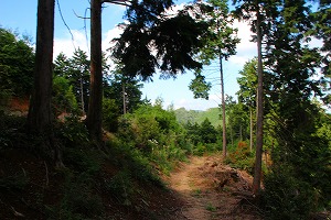 大手道はいきなりかなりの段数の階段を登る羽目になる。しかも最近この辺りは何度も激しい夕立にあっているせいか、足下がかなり水が湧いていて通路が川状態。気を付けて進まないと足下が滑る。さらに参ったのがクモの巣の多さ。雨が止んで一斉に巣を張ったのか、進むたびにクモの巣が顔にかかるので、登山杖を杖として使うよりもクモの巣除けに振り回し続けている状態。これでは疲れるので、通路に落ちていた木の枝を拾ってクモの巣除けにする。
