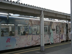 夕食を終えるとしばし町中を散策。七尾駅に立ち寄るとのと鉄道の駅に何やらペイント列車が。どうも何かのアニメのラッピング列車であるが、後で調べたところによると「花咲くいろは」なるアニメ作品らしい。この作品のことはよく知らないが、どうやらこの沿線の温泉地が舞台となったようだ。別に聖地巡礼する気なんて毛頭ないのに、なぜかこの手のものに各地で出くわしてしまうこの因縁。ちなみにこの作品には全く興味がないが、正直なところこの絵柄は結構好みだったりするな・・・。