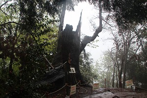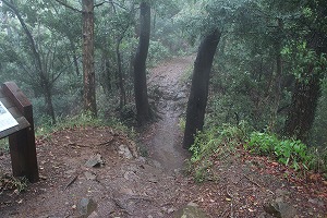 入口から少し進んでみたがいきなり道が分岐しておりどっちに進むかが分からない。しかも雨が激しさを増してきて足下が怪しさを増すと共に辺りは薄暗くなってきている。さらに先ほど向こうの山をうろついたので足が完全に終わっている。道を確認するためにウロウロしている体力も時間もなさそうである。ここに至って撤退を決定する。