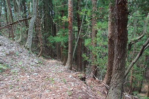 左 一段下にも曲輪があるようだ 中央 裏手を降りる 右 切岸はかなり険しい 砥石城の裏側には堀切が切ってあり、その先に数段の曲輪が連なる本城がある。ここは明らかに各曲輪の規模が大きく、さらには東側の斜面には帯曲輪らしき構造も見える。配備できる兵の数も多く、ここが戸石城の中心であることが分かる。