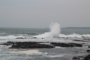 岩がゴツゴツした海岸で、そこに荒波が押し寄せる様はそれだけでかなりの見物。リアル東山魁夷の絵画世界が展開する。こういう海岸や、冬山などの風景を見ていると、確かに日本の風景を表現するのに水墨画ほど適した手法はないと感心したりするのである。下手にゴテゴテと色を使うより、モノトーンの水墨画の方がしっくりくる。春の華やかさや夏の生命力を表現するのは水墨画では厳しい点があるが、冬の厳然として清澄なる空気を表現するにはあれを超える手法はない。去年訪問した冬の兼六園なんかも見事に水墨画の風景となっていた。そして、薄曇りの中の荒々しい日本海岸の風景もどちらかというと水墨画テイストである。