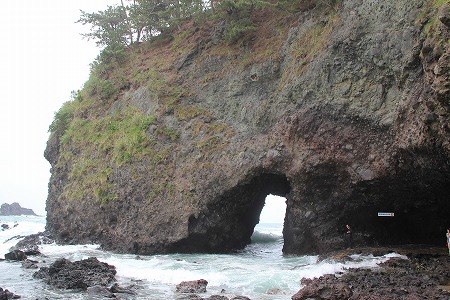 巌門は日本海の荒波で岩に穴がうがたれたいわゆる奇岩。東尋坊などのような日本海岸に散在する景勝地の一つである。現地は観光用の駐車場なども完備され、多くの観光客が訪れている。巌門を船で見学することなども出来るそうだが、今日は海が荒れているのでツアー船は欠航の模様。そこで徒歩で見学することにする。