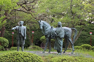 左 何やら庭園もある 中央 ここは櫓台跡か 右 本丸からの風景 完全に公園整備されてしまっていて旧状が伺いにくい。本丸跡には大河ドラマを意識したと思われる利家とまつの像が建っている。そうそう利家のためにまつがへそくりで馬を買ったシーンだな・・・と思ったところで、それは山内一豊の妻の間違いだったことに気づいた。そう言えば高知城にそのものズバリの山内一豊の妻と馬の像があった。どうもこの両者、同じような頃に大河ドラマになっているので紛らわしい。こっちは仲間由紀恵の方ではなくて、松嶋菜々子の方だった。どちらも美人だが、私は仲間由紀恵の方が好みだ。