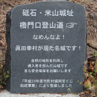 案内に従って進むと駐車場に誘導される 現地に到着すると手前からしっかりと案内看板が出ており、案内看板付きの駐車場も整備されている。どうやら最近に宝くじ助成の事業として城跡の整備がなされたようだ。入口部分には明らかに某ゲームのイメージを引きずっていると思われる真田幸村の幟の立ったなんちゃって城門まで建てられており、登城路も通常の山城の登城路に比べるとハイウェイに感じられるぐらいの整備のされようである。