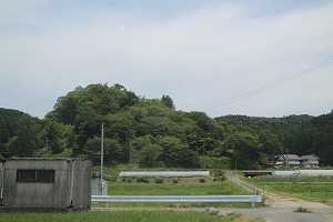 腹がふくれたところで残りの城郭視察である。今度は山上にある文珠山城と賽之神城に立ち寄るつもり。途中で歴史民俗資料館に立ち寄って資料を入手すると、この近くから出ている林道へ入る。林道はかなり荒れた砂利道の上に登り坂。非力なミラージュだと途中で砂利をはじき飛ばしてタイヤが滑ってるのが分かる。このままだとその内にスリップして登れなくなるのではと心配になった頃にようやく舗装道路に変わる。後はそのまま山頂まで登ると文珠山城の近く。