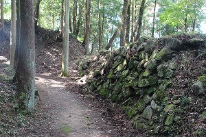 登山道を進むとすぐに土塁に突き当たり、そこの先には井戸がある。この井戸があるのは太鼓櫓などに囲まれた窪地。先の土塁はこの井戸を守るためか。