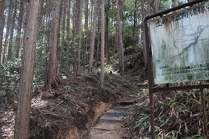 ここも登城口に駐車場が完備されている。駐車場に車を置くと、通行量の結構多い県道を横切って登城口へ。ここを数メートル登るとすぐに屋敷跡がある・・・のだが、いきなりそこにたどり着くまでの石段で転倒。まだ登山にもかかっていないのに前途多難である。