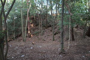 左 土塁に囲まれたスペース 中央 井戸跡 右 脇に蔵跡に登る道が ここの脇に蔵跡と言われる小さいな平地がある。この上が一の曲輪。ここは今は登山道が通してあるが、本来は道はなくて三の曲輪から回り込む形になっていたという。