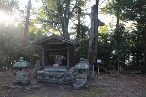 左 本丸にある旗立岩 中央 本丸の祠 右 一段下が二の曲輪 ![]()
