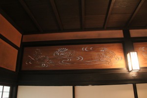 建物内部、襖絵や欄間などかなり立派である 鴨方往来は今では完全に普通の住宅地で、住宅も大部分が近代化してしまっているが、道の細さや構造(鍵の手などもある)などに往時の面影をとどめている。また寺社なども多く、鴨神社の参道の石造りの太鼓橋である宮の石橋は「鴨方に過ぎたるものが三つある。拙斎・索我・宮の石橋」と謡われた鴨方三奇の一つとして以前から知られているとか。石組みの橋でなく、反り返った長い石を渡した橋になっているのが特徴。なお三奇の後の二つの拙斎は江戸時代の儒学者・西山拙斎のことで、索我は同じく江戸時代の画家の田中索我のことだとか。要は地元出身の文化人である。